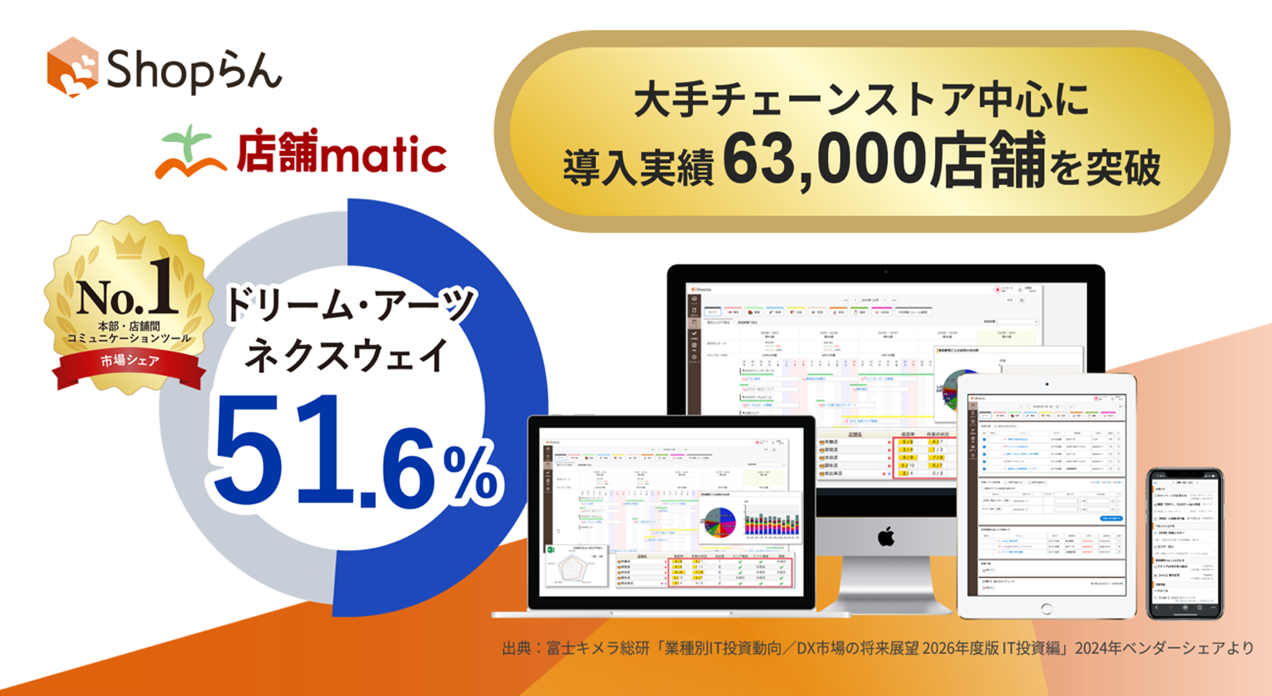 大企業向けクラウドサービスを提供する株式会社ドリーム・アーツ(東京本社:東京都渋谷区、広島本社:広島県広島市、代表取締役社長:山本 孝昭、以下 ドリーム・アーツ)とTISインテックグループの株式会社ネクスウェイ(本社:東京都江東区、代表取締役社長:坂本 倫史、以下ネクスウェイ)(※1)は、マーケット調査会社の株式会社富士キメラ総研(以下、富士キメラ総研)が発刊した「業種別IT投資動向/DX市場の将来展望 2026年度版 IT投資編」において、「Shopらん®(ショップラン)/店舗matic(テンポマティック)」が、本部・店舗間コミュニケーションツール市場シェア51.6%でNo.1(※2)を獲得したことを発表します。